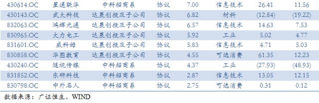中科招商+深创投+达晨创投:34家重仓标的在手。根据新三板各股前十大股东的资料,我们发现有34家标的的前十大股东中包含这三家知名创投机构,其中中科招商系机构重仓标的10家,深创投及子公司重仓9家,达晨创投及子公司重仓15家标的。从交易方式来看,这34家企业中有9家做市企业,25家协议企业。9家做市标的中,达晨创投重仓的有5家,中科招商系3家,深创投1家。